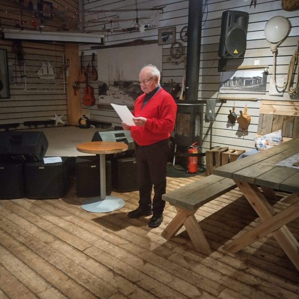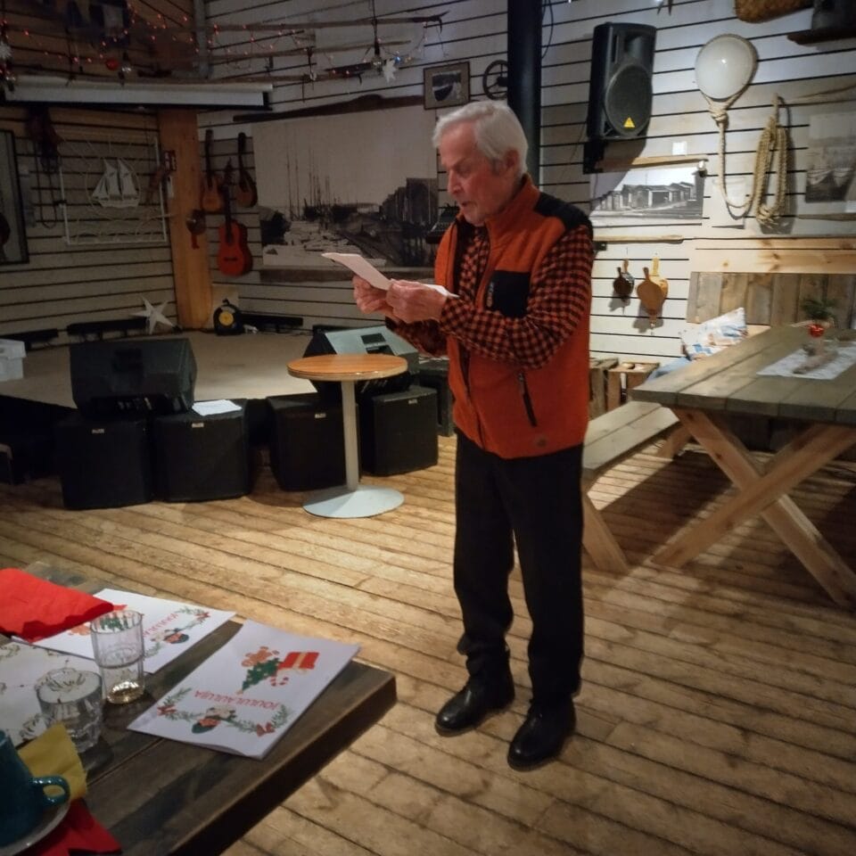 Tilaisuuden avasi Pertti, joka esitteli myös päivän ohjelman. Juhlava tunnelma käynnistyi yhteislaululla ”Arkihuolesi kaikki heitä”, minkä jälkeen nautittiin maittava pääruoka. Pää- ja jälkiruoan välissä kuultiin Arvon kertomia humoristisia tarinoita, jotka herättivät runsaasti iloa ja naurua.